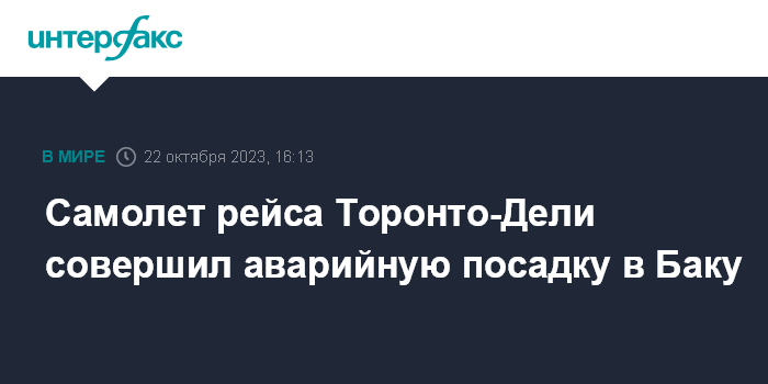Москва. 22 октября. INTERFAX.RU - Самолет Air Canada, выполнявший рейс Торонто-Дели, совершил экстренную посадку в Международном аэропорту Гейдара Алиева.