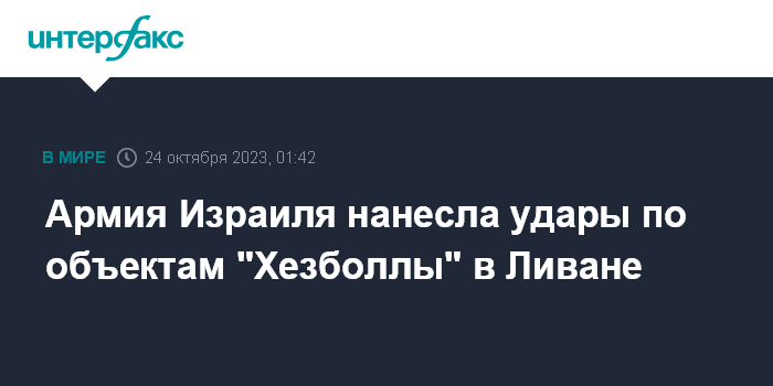 Москва. 24 октября. INTERFAX.RU - Армия обороны Израиля (ЦАХАЛ) нанесла удары по ряду инфраструктурных объектов шиитского движения "Хезболла" в Ливане.