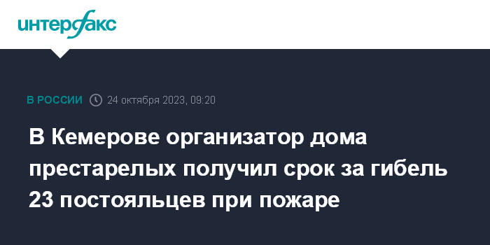 Москва. 24 октября. INTERFAX.RU - В Кемерове Заводской районный суд приговорил к пяти годам колонии общего режима Андрея Смирнова, который открыл нелегальный дом престарелых в частном помещении. В декабре 2022 года в этом доме престарелых случился пожар и погибли 23 человек.