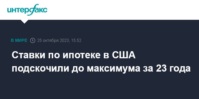 Москва. 25 октября. INTERFAX.RU - Средний размер ставок по 30-летним ипотечным кредитам в США на неделе, завершившейся 20 октября, подскочил сразу на 20 базисных пунктов по сравнению с предыдущей неделей и достиг максимума с сентября 2000 года. Об этом говорится в сообщении Ассоциации ипотечных банкиров (Mortgage Bankers Association, MBA).