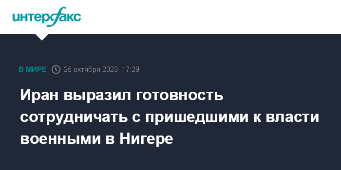 Москва. 25 октября. INTERFAX.RU - Президент Ирана Ибрахим Раиси выразил готовность работать с военными, которые пришли к власти в Нигере, сообщают ближневосточные СМИ.