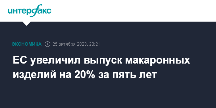 Москва. 25 октября. INTERFAX.RU - Государства Европейского союза в 2022 году произвели 6,1 млн тонн макаронных изделий на сумму 7,8 млрд евро, сообщило статистическое управление ЕС (Eurostat).
