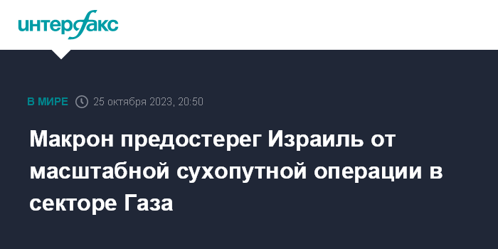 Москва. 25 октября. INTERFAX.RU - Президент Франции Эммануэль Макрон в среду заявил, что, на его взгляд, крупная сухопутная операция Израиля в секторе Газа стала бы ошибкой.
