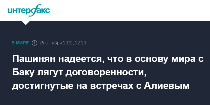 "Мы надеемся, что договоренности, достигнутые на четырехсторонней встрече в Праге 6 октября 2022 года, на трехсторонней встрече в Брюсселе 14 мая 2023 года и на трехсторонней встрече в Брюсселе 15 июля 2023 года в ближайшее время будут оформлены, подтверждены и станут основой мирного договора", - сказал Пашинян в интервью The Wall Street Journal.