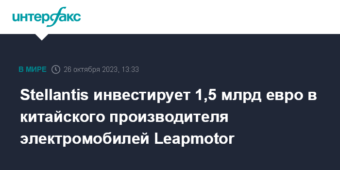 Москва. 26 октября. INTERFAX.RU - Европейский автомобильный концерн Stellantis NV намерен инвестировать 1,5 млрд евро в китайского производителя электромобилей Zhejiang Leapmotor Technology.