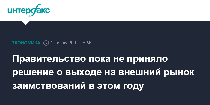 Москва. 30 июля. INTERFX.RU - Правительство РФ пока не приняло решение о выходе на внешние рынки заимствований в 2009 году, заявил вице-премьер - министр финансов РФ Алексей Кудрин на брифинге по итогам заседания правительства.
