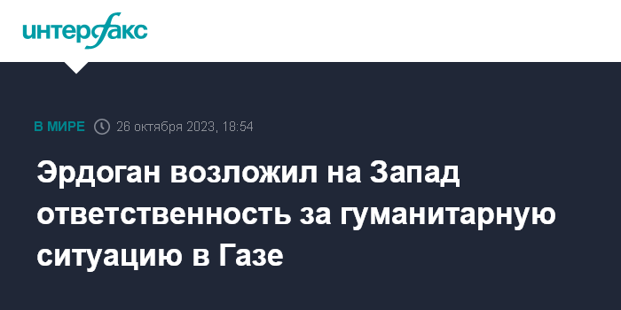 Москва. 26 октября. INTERFAX.RU - Президент Турции Реджеп Тайип Эрдоган заявил, что западные страны несут часть ответственности за происходящее в секторе Газа, поскольку не призывают к прекращению огня.