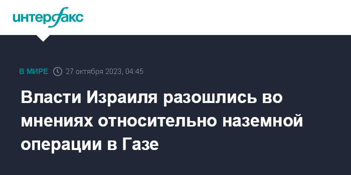 Москва. 27 октября. INTERFAX.RU - Армия Израиля готова вторгнуться в сектор Газа, но военные и политические лидеры расходятся во мнениях о том, когда и как начать операцию, сообщает New York Times со ссылкой на высокопоставленных военных и чиновников.