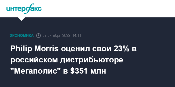 Philip Morris оценил свои 23% в российском дистрибьюторе "Мегаполис" в $351 млн