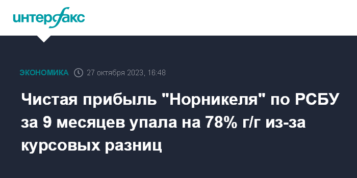 Чистая прибыль "Норникеля" по РСБУ за 9 месяцев упала на 78% г/г из-за курсовых разниц