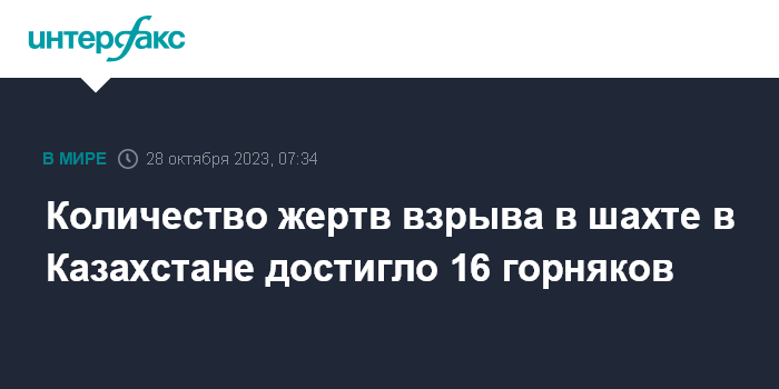 Москва. 28 октября. INTERFAX.RU - Число погибших в результате аварии на шахте имени Костенко АО "АрселорМиттал Темиртау" увеличилось до 16 человек.