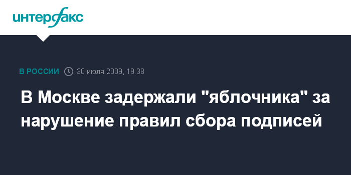 Москва. 30 июля. INTERFAX.RU - В четверг в Новопушкинском сквере за нарушение правил сбора подписей был задержан представитель партии "Яблоко", сообщил в четверг "Интерфаксу" дежурный офицер Управления информации и общественных связей ГУВД Москвы Анатолий Ластовецкий.