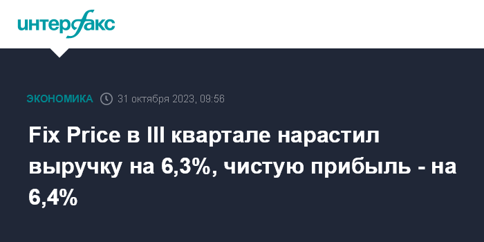 Москва. 31 октября. INTERFAX.RU - Выручка Fix Price в III квартале выросла на 6,3% по сравнению с аналогичным периодом прошлого года и составила 74,5 млрд рублей, говорится в сообщении компании.