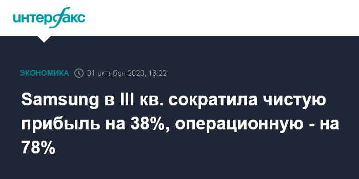 Москва. 31 октября. INTERFAX.RU - Южнокорейская Samsung Electronics Co., крупнейший мировой производитель полупроводниковой продукции и смартфонов, в третьем квартале сократила чистую прибыль на 38%, согласно окончательным данным.