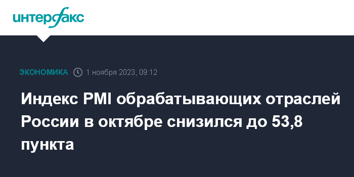 Москва. 1 ноября. INTERFAX.RU - В октябре 2023 года индекс PMI обрабатывающих отраслей России составил 53,8 пункта, немного опустившись с сентябрьских 54,5 пункта, показало исследование S&P Global.