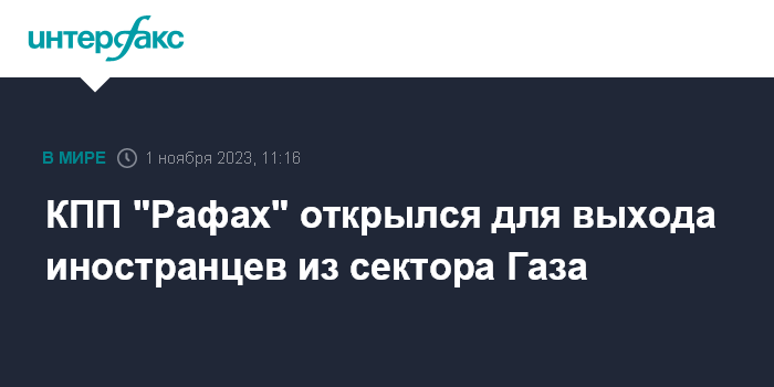 Москва. 1 ноября. INTERFAX.RU - Впервые с начала обострения конфликта между Израилем и ХАМАС КПП "Рафах" открылся для иностранцев и раненых палестинцев, желающих покинуть сектор Газа, сообщает в среду Al Jazeera со ссылкой на трансляцию.