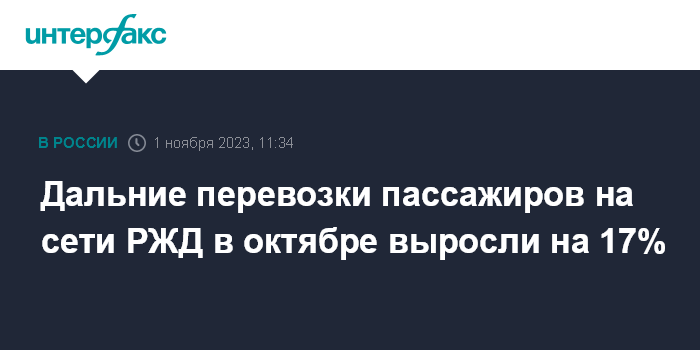 Москва. 1 ноября. INTERFAX.RU - Перевозки пассажиров в дальнем следовании на сети ОАО "Российские железные дороги" выросли в октябре 2023 года на 17% к аналогичному периоду прошлого года, до 9,6 млн человек, сообщила компания.