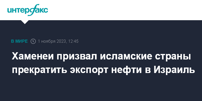 Москва. 1 ноября. INTERFAX.RU - Духовный лидер Ирана и высший руководитель страны аятолла Али Хаменеи заявил, что исламские страны должны заблокировать поставки нефти и продовольствия в Израиль из-за его действий в секторе Газа. Его цитируют иранские СМИ.