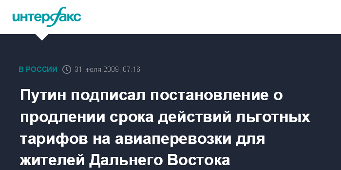 Путин подписал постановление о продлении срока действий льготных тарифов на авиаперевозки для жителей Дальнего Востока