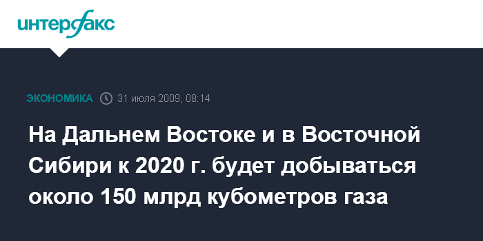 Москва. 31 июля. INTERFAX.RU - К 2020 г. на Дальнем Востоке и в Восточной Сибири будет добываться около 150 млрд кубометров газа в год, заявил в пятницу премьер-министр РФ Владимир Путин.