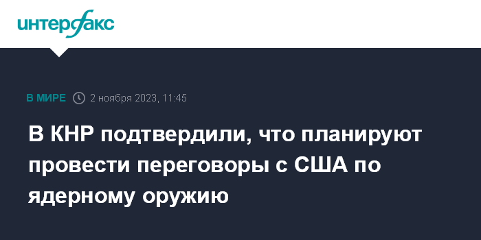 Москва. 2 ноября. INTERFAX.RU - Представители Китая и США на следующей неделе проведут переговоры, которые будут посвящены, в частности, вопросам контроля над ядерными вооружениями, сообщили в четверг в МИД КНР.