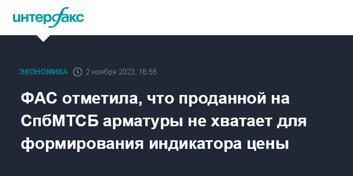 Москва. 2 ноября. INTERFAX.RU - Объем реализованной на СПбМТСБ арматуры пока недостаточен для того, чтобы сформировать справедливый ценовой индикатор для рынка. Об этом говорится в сообщении Федеральной антимонопольной службы (ФАС) РФ.
