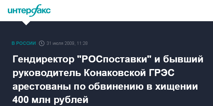 Гендиректор "РОСпоставки" и бывший руководитель Конаковской ГРЭС арестованы по обвинению в хищении 400 млн рублей
