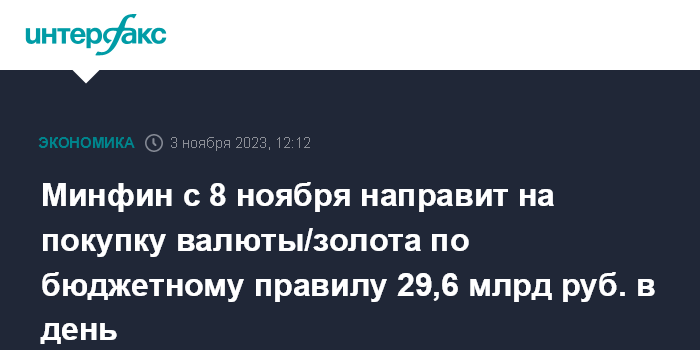 Минфин с 8 ноября направит на покупку валюты/золота по бюджетному правилу 29,6 млрд руб. в день