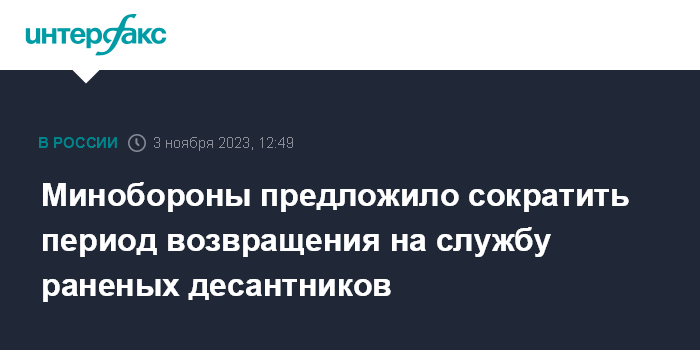 Москва. 3 ноября. INTERFAX.RU - Минобороны РФ подготовило проект об изменениях в инструкции организации направления военнослужащих, проходящих военные сборы, на медицинское освидетельствование, предусматривающее сокращение сроков возвращения военнослужащих Воздушно-десантных войск на службу после ранения.