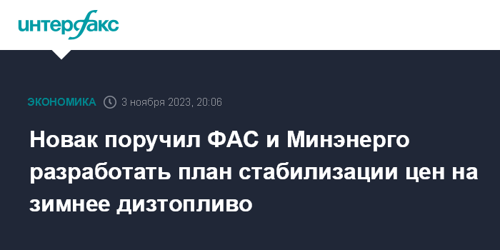 Москва. 3 ноября. INTERFAX.RU - Федеральная антимонопольная служба (ФАС) и Минэнерго РФ должны разработать план по стабилизации цен на зимнее дизельное топливо на весь период спроса, а также предложить меры противодействия диспаритету цен на него в оптовом и розничном сегментах, сообщается на сайте правительства РФ.