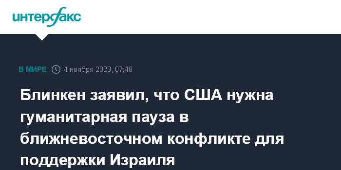 Блинкен заявил, что США нужна гуманитарная пауза в ближневосточном конфликте для поддержки Израиля
