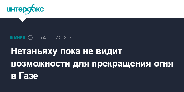 Москва. 5 ноября. INTERFAX.RU - Премьер Израиля Биньямин Нетаньяху заявил, что не будет рассматривать идею прекращения огня в секторе Газа до тех пор, пока ХАМАС не вернет свободу всем заложникам.
