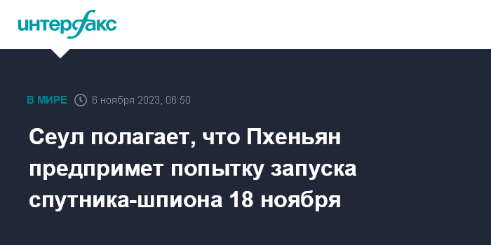 "Ренхап" обращает внимание, что накануне Пхеньян объявил о том, что 18 ноября будет праздноваться в стране как День ракетной промышленности в ознаменование успешного пуска в этот день в 2022 году МБР "Хвасон-17". В Сеуле считают, что новая попытка запуска спутника будет приурочена к этой дате.