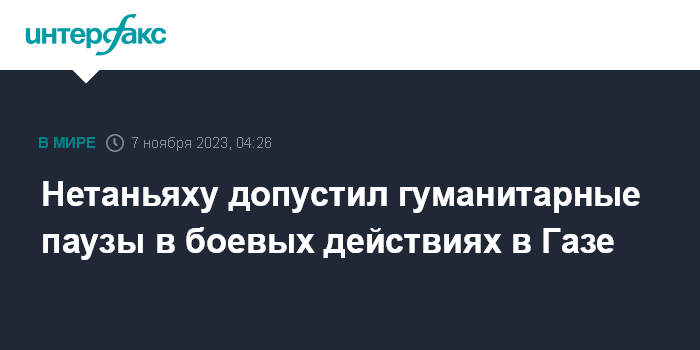 Москва. 7 ноября. INTERFAX.RU - Премьер-министр Израиля Биньямин Нетаньяху считает возможным кратковременное выборочное прекращение огня в ходе боевых действий в секторе Газа в гуманитарных целях.