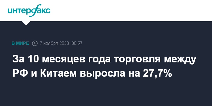 Москва. 7 ноября. INTERFAX.RU - В январе-октябре 2023 года товарооборот между Россией и Китаем увеличился в годовом исчислении на 27,7%, составив $196,48, свидетельствуют опубликованные данные главного таможенного управления КНР.