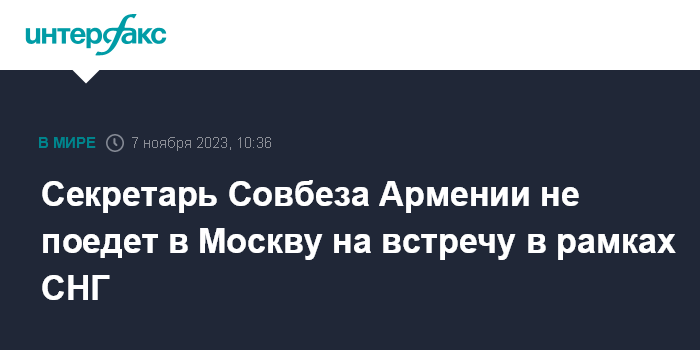 Москва. 7 ноября. INTERFAX.RU - Секретарь Совета безопасности Армении Армен Григорян не примет участия в очередной встрече глав совбезов стран СНГ в Москве, намеченной на 8 ноября.