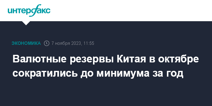 Москва. 7 ноября. INTERFAX.RU - Валютные резервы КНР, крупнейшие в мире, в октябре уменьшились до $3,101 трлн по сравнению с $3,115 трлн в предыдущий месяц, говорится в отчете Народного банка Китая.