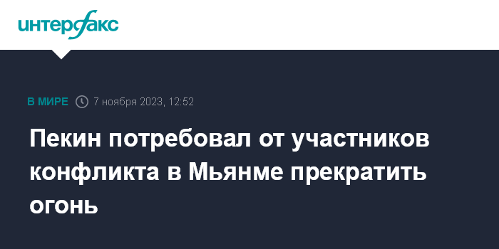 "Китай вновь требует от всех сил, вовлеченных в конфликт на севере Мьянмы, незамедлительно прекратить огонь, принять реалистичные меры для предотвращения инцидентов, которые не угрожали бы вновь жизни и имуществу жителей приграничных районов Китая", - заявил представитель МИД Китая Ван Вэньбинь.