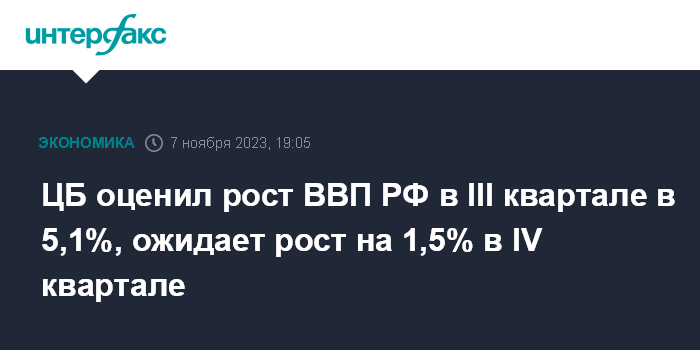 Москва. 7 ноября. INTERFAX.RU - Рост ВВП РФ в III квартале 2023 года составил, по расчетам ЦБ, 5,1% в годовом выражении. Соответствующая оценка содержится в докладе Банка России о денежно-кредитной политике.