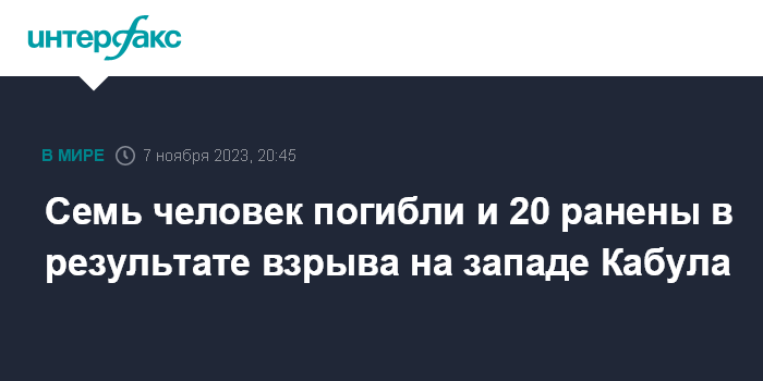 Москва. 7 ноября. INTERFAX.RU - В результате взрыва в Кабуле во вторник вечером погибли семь мирных жителей, еще 20 получили ранения, сообщил в соцсетях пресс-секретарь столичного управления полиции Афганистана Халид Задран.