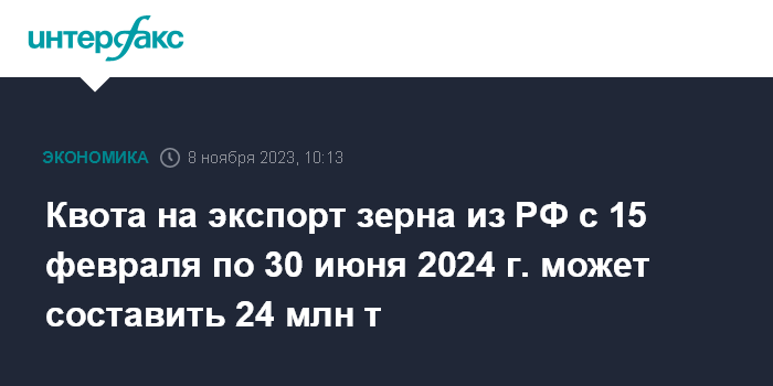 Квота на экспорт зерна из РФ с 15 февраля по 30 июня 2024 г. может составить 24 млн т