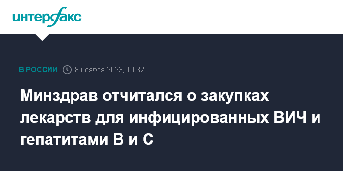 Москва. 8 ноября. INTERFAX.RU - Поставки лекарств в регионы для пациентов, инфицированных ВИЧ в сочетании вирусами гепатита B и C, ведутся по всем государственным контрактам; прорабатывается вопрос дополнительной закупки препаратов до конца 2023 года, сообщили "Интерфаксу" в Минздраве России.