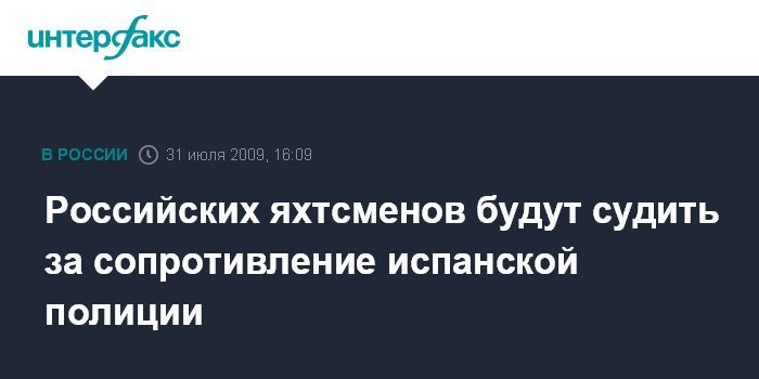 Москва. 31 июля. INTERFAX.RU - Испанские власти обвиняют российских яхтсменов в оказании сопротивления сотрудникам полиции. Как сообщил в пятницу "Интерфаксу" пресс-секретарь посольства РФ в Испании Сергей Обознов, на первые числа августа назначено судебное заседание. Он добавил, что на судебное заседание обязательно будет направлен представитель Генконсульства РФ в Барселоне.