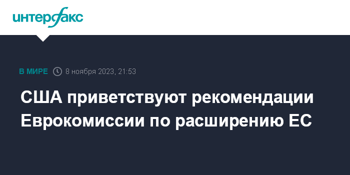 Москва. 8 ноября. INTERFAX.RU - США приветствуют рекомендации Еврокомиссии (ЕК) по старту переговоров о вступлении в ЕС некоторых стран и призывают эти страны реализовать свой потенциал, заявил в среду представитель госдепа США Ведант Патель.