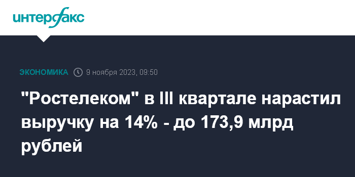 Москва. 9 ноября. INTERFAX.RU - ПАО "Ростелеком" по итогам III квартала 2023 года нарастило выручку на 14% - до 173,9 млрд рублей, сообщила компания.