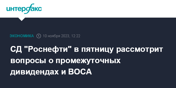 Москва. 10 ноября. INTERFAX.RU - Совет директоров "Роснефти" 10 ноября рассмотрит вопросы о промежуточных дивидендах, сообщает компания.