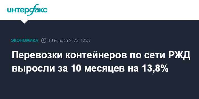 Москва. 10 ноября. INTERFAX.RU - Перевозки контейнеров по сети ОАО "РЖД" во всех видах сообщения, включая экспорт, импорт и транзит, выросли в январе-октябре 2023 г. на 13,8% к аналогичному периоду прошлого года, до 6 млн 114,4 тыс. груженых и порожних контейнеров TEU, сообщила компания.