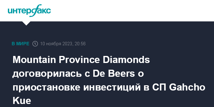 Москва. 10 ноября. INTERFAX.RU - Канадская алмазодобывающая компания Mountain Province Diamonds (MPD) договорилась с De Beers о приостановке части расходов по СП Gahcho Kue (Гачо Куэ) из-за сложного состояния рынка алмазов, говорится в сообщении MPD.