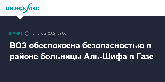 Москва. 12 ноября. INTERFAX.RU - Всемирная организация здравоохранения (ВОЗ) заявила о серьезной обеспокоенности безопасностью работников и пациентов одной из крупнейших в секторе Газа больниц - Аль-Шифа.