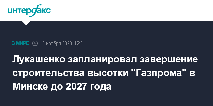 Москва. 13 ноября. INTERFAX.RU - Строительство "Газпром Центра" в Минске должно быть завершено до 2027 года, такой срок утвердил президент Белоруссии Александр Лукашенко, сообщила агентству "Минск-Новости" председатель комитета строительства и инвестиций Минского горисполкома Ирина Гонтарева.